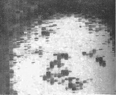 著者のDonaldは英国グラスゴー大学の産婦人科医なので,症例は卵巣嚢胞(図7),子宮筋腫,妊娠子宮である.提示されている画像は,非常に粗い二値画像で,腫瘍や胎児の輪郭が辛うじてわかる程度で,著者もまだ装置は未熟であり,臨床に供するレベルに達していないと結論している.しかし,嚢胞性か充実性かの鑑別にはある程度役立ち,腹水を伴う胃癌と診断されていた患者が,超音波検査で卵巣嚢胞と判明した症例,子宮筋腫の術前検査で,妊娠していることが明らかとなった症例などが紹介されている.