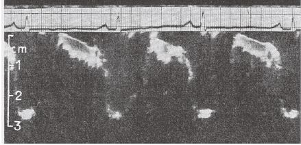 さらにAモードの波形を表示するオシロスコープの画面の前に幅5mmのスリットを設けてこれ映画カメラで撮影することにより,輝線の動きを連続的に時間軸上に記録する方法を考案した.著者はUCG(ultrasonic cardiography,超音波心臓図)と名づけているが,これは現在のMモード法に外ならない.心電図との同時記録も行なわれている.ここでは,正常例,大動脈弁閉鎖不全症,僧帽弁狭窄症のUCGが提示され,左室後壁,左房後壁の動きが論じられている.しかし,ここで左房壁とされていたエコーは,その後僧帽弁前尖であることがわかり[22](図8),以後Edlerは特に弁膜症における弁尖のMモード波形の研究を続け,例えばその後僧帽弁狭窄症の重要な診断指標となった僧帽弁前尖後退速度に関する知見も既に明記している[23].Edler自身は,1969年にDoppler法の報告を最後に心エコーの研究を行なっていないが,以後超音波検査は循環器疾患の検査手段として必須のものとなり,Edlerは心臓超音波検査の父とされる.