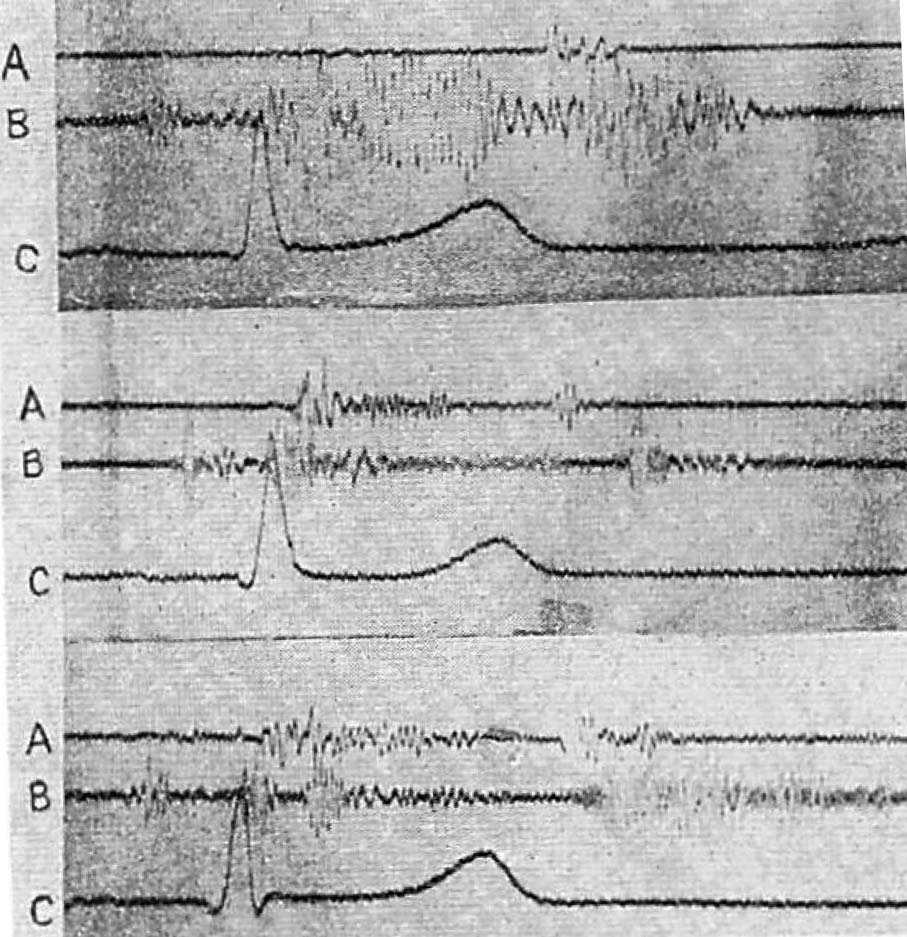 図12.上から低周波ドプラ信号,高周波ドプラ信号,ドプラ心雑音.A:心音,B:ドプラ信号,C:心電図