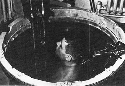図2. Howry & Homesによる超音波検査装置Somascope.B29爆撃機の回転砲塔を利用した水槽で頸部を検査している [7].
