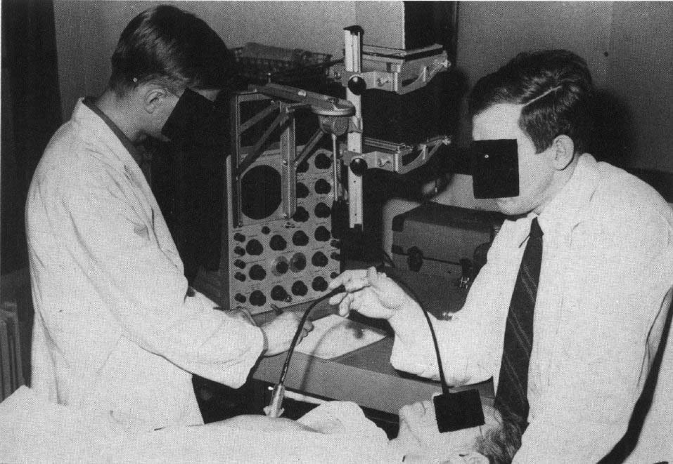 探触子は,水を満たした小さな容器の一端に圧電クリスタル,他端をコンドームの薄いゴム膜で閉鎖したもので,探触面は径9mm,それ以外に詳しい寸法の記載がないが,写真でみるとちょうどペンライト程度で,ゴム膜面を皮膚に接触させる.Stethoscope(聴診器) にならって Echoscope(エコスコープ)の名称を提案しているが,まさに聴診器を当てるようにして検査している(図3).超音波は,周波数15MHzのパルス波で,Aモードの波形をオシロスコープに表示する(技術的詳細については別項に記載されている[11][12]).