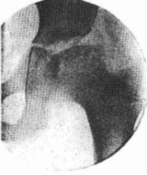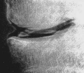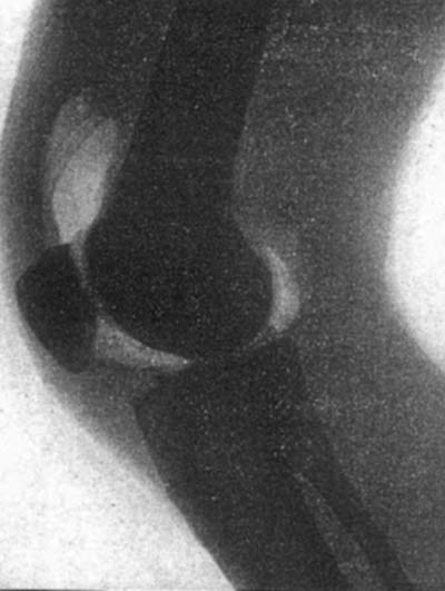 図9.酸素による膝関節造影.正常像[25].関節包はわかるが,半月板など膝内構造は良く見えない.