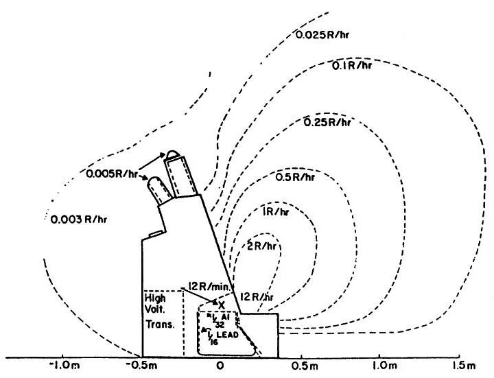 図中の線量分布を見ると,計測部の足の位置では12R/minで,吸収線量は(1R≒1radとすると)120mGy/min,実際の透視時間は1回20秒程度であったとのことなので,1回40mGyであれば急性障害を来たすほどでない.観察スコープの位置では0.005R/hr ≒ 0.05mGy/hrで,おそらく健康被害は実際になかったのであろう.しかし,X線装置が野放しの状態で1960年代まで使用されていたということは驚くべきことである.