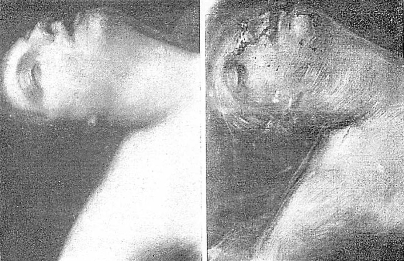 このような知識をもとに,実際例として17世紀のイタリアの画家による「ルクレチアの死」を細かく分析している(図4).この絵は一度修復されていることが分かっているが,X線写真によってたとえば顔や肩の部分の傷が上塗りされ修正されていること,指の形に手が加えられていることなどが見て取れた.また別の絵では,肉眼では見えなかった画家のイニシャルがX線で発見された.このようにX線は表からは見えない絵画の特徴を明らかにして,真正性や画家の画風を検討できる可能性があり,さらに研究を進める価値があると結んでいる.この時点で,実際にX線撮影を試みたのはまだ4例であるが,この後さらに例数を増やした続報を著している[7].
