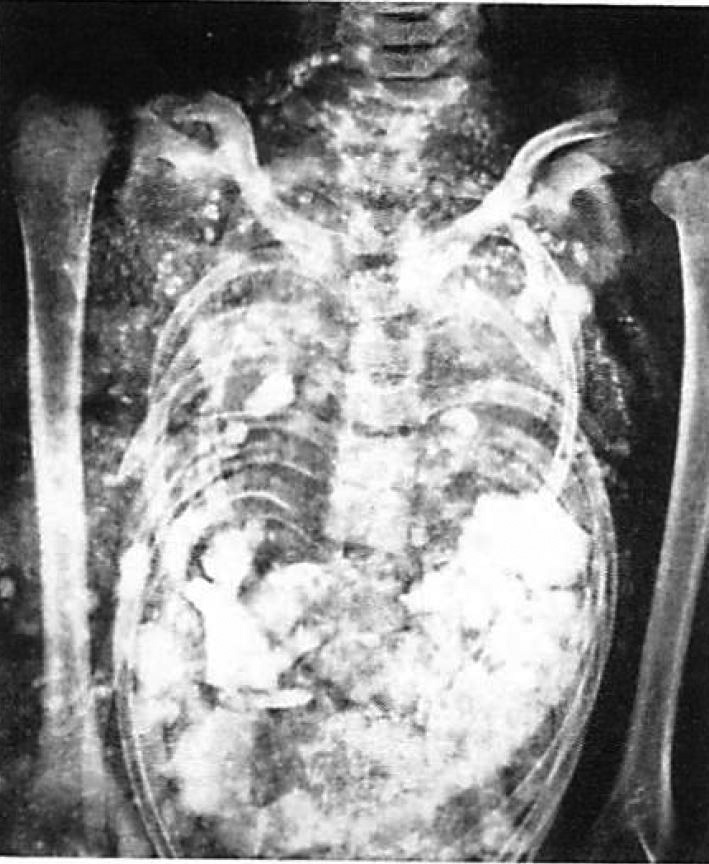 【解説】ミイラのX線撮影は,誰しも考えるところで,X線発見直後から散発的に行われていた.しかし,多数例を撮影して,ある程度まとまった所見を記載したのは,この論文が初めてである.