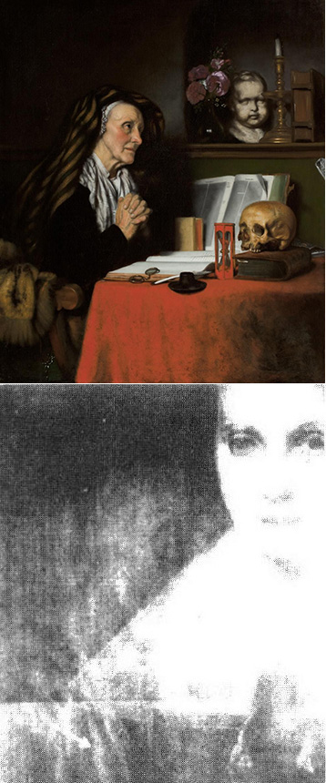 図3.上:Nicholar Maes作.テーブルで祈る老婆(1656).下:X線像では,下地に全く別の絵が描かれていることがわかる.[12]