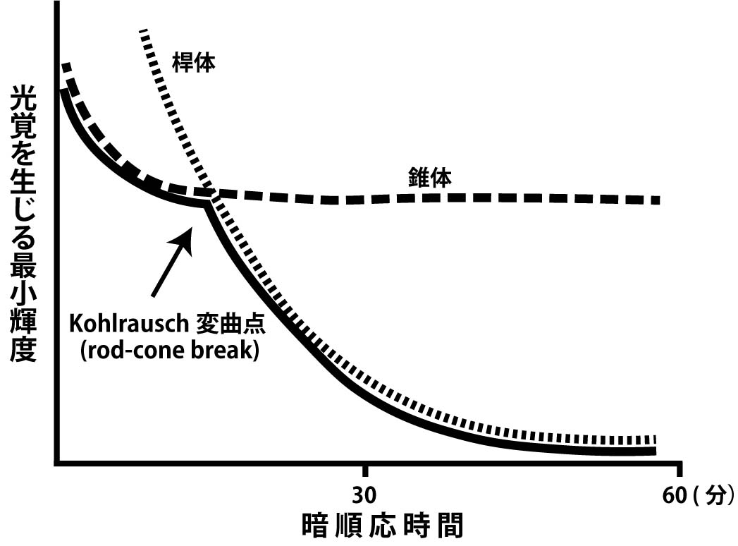 図7.明所から暗所に移動後の時間と網膜の感度(=光覚を生じる最小輝度)の関係.破線:錐体のみの感度,点線:桿体のみ感度,実線:両者をあわせた実際の感度で,10分前後に変曲点を持つ二相性の変化を示す.錐体は速やかに順応するが最大感度は低い.桿体は高感度であるが順応には数十分を要する.