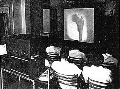図5. テレビジョン型増幅装置を使ってカンファレンスを行なっている様子.暗室外でこれほど高輝度の透視画像を観察できることは画期的であった.
