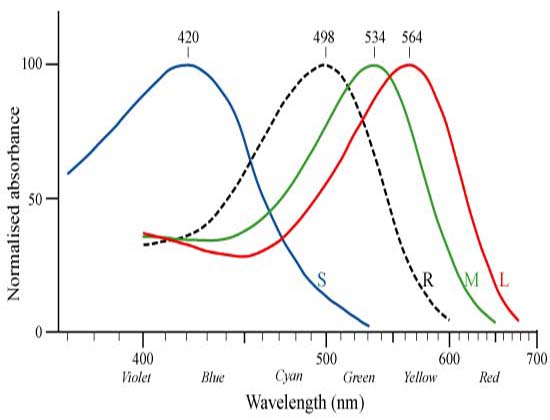図8. 光の波長と視細胞の感度の関係.黒線は桿体,赤線,緑線,青線はそれぞれの色に感度をもつ錐体の感度を示す.桿体の感度は比較的短波長にあるため,赤色光は桿体の暗順応に影響しにくい利点がある[9].