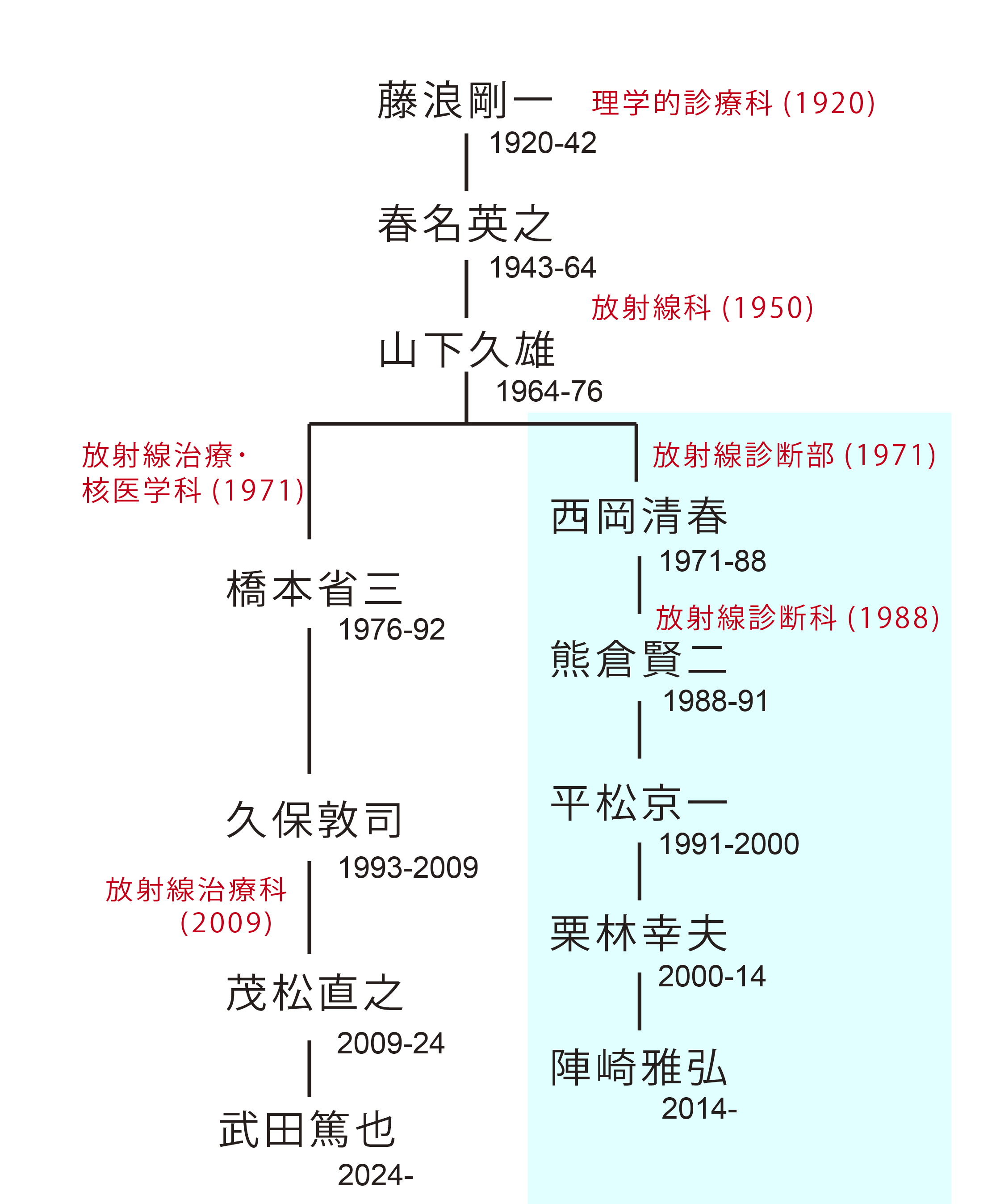 慶應義塾大学医学部放射線医学教室は,1920年,初代教授藤浪剛一の下で理学的診療科として始まり,1950年に放射線科学教室と改称,1971年,第3代山下久雄教授の時代に,放射線診断部門が病院長直属の放射線診断部として独立,1988年に放射線診断部が放射線診断科として医学部の教室となるとともに1教室(放射線科学教室)2診療科(放射線治療・核医学科,放射線診断科)体制となり,さらに2009年には核医学部門が放射線診断科に併合されるなど,幾多の変遷を経て現在に至っている