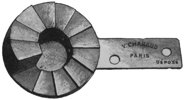 図7. BenoistのX線硬度計.中央の銀円板を取り巻いて,12分画のアルミニウム階段が配されている.X線を照射して,中央と等濃度の階段数を硬度とする.