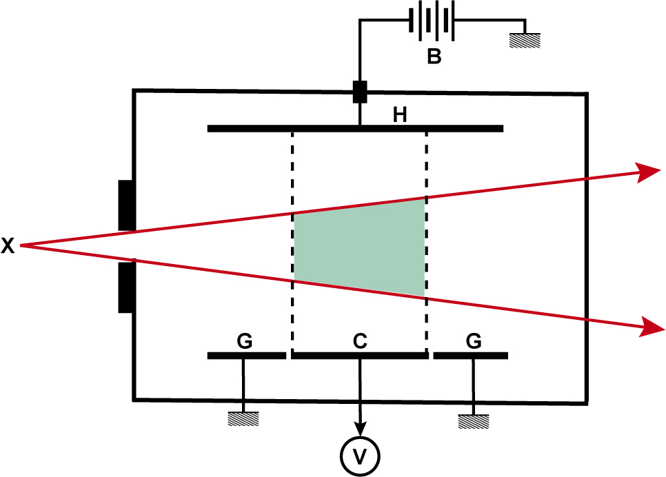 図4. 通気型平行電極電離箱の構造.X線束(X)により発生するイオンを,電源(B)につないだ高圧電極(H),集荷電極(C)間の電界で集め(緑色の部分),電位計(V)に流れる電流を計測する.集荷電極の両側の保護電極(G)は電界の方向を補正するためのもの.