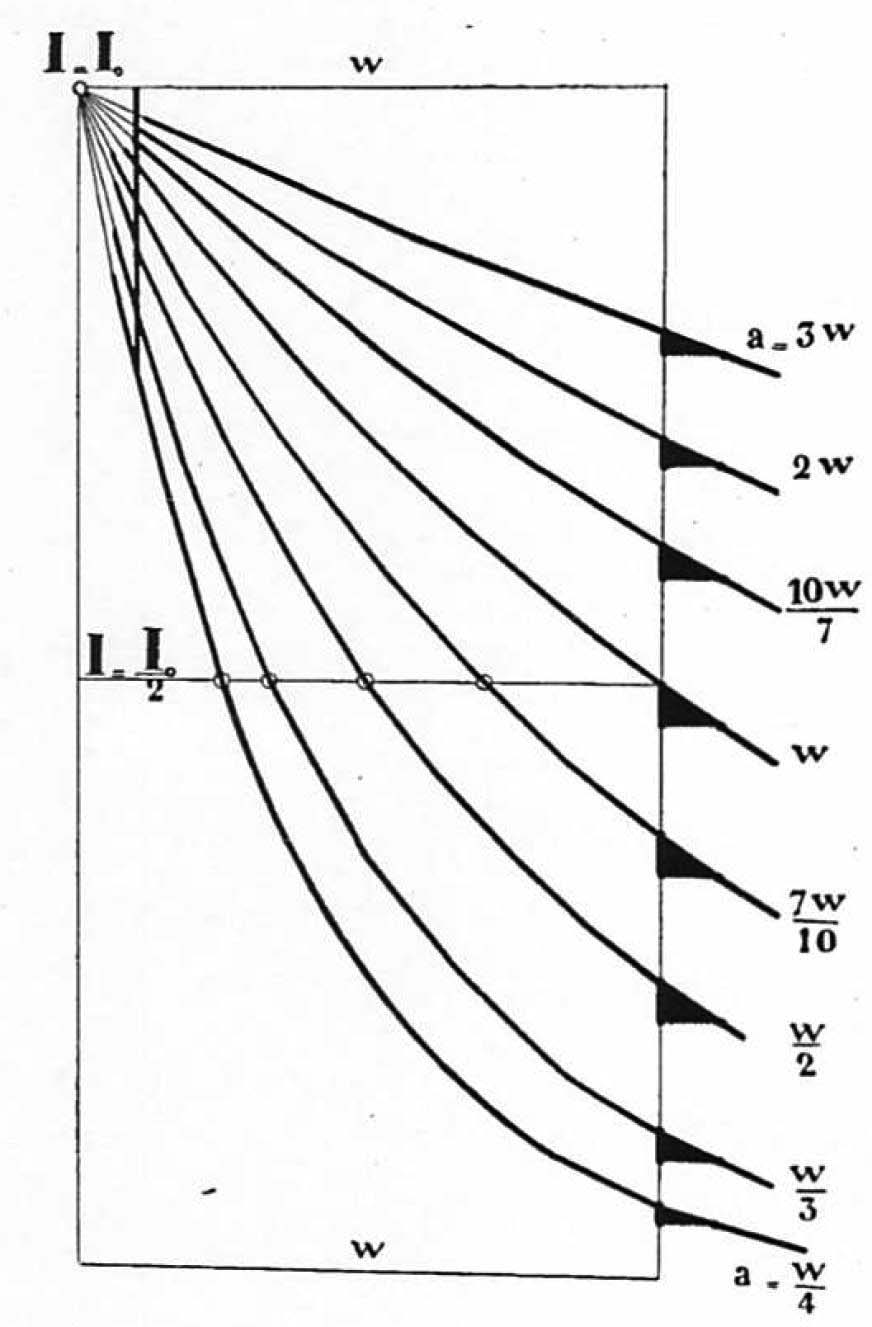 まず数式ならびにグラフを使った理論的解説によって半価層を解説し,半価層を軟部組織厚に等しくすると,深部線量が最大,皮膚線量が最小となることを示し(図8),深部治療に容易に応用できることを示している.具体的な計測法としては,蒸留水の半価層が最適としつつも,水の使用は実用的でないことから,水とほぼ同等の吸収能をもつベークライトを使用している.X線不透過性の金属板(材質は指定されていない)に多数の小孔をあけ,小孔の面積が表面積のちょうど半分となるようにした半価板によって強度が半減したX線を作り,これとベークライト製の階段を通過したX線とを透視板で目視的に観察して,両者の輝度が等しくなるようなベークライト階段の厚さから半価層を知ることができるという原理である(図9) .この方法は,物理学に暗い医師にも容易に理解でき,臨床的にも有用な方法であるとしているが,実際,約20年後の1931年,第3回ICRで半価層をもって線質表示とすることが決定され,現在も広く利用されている.