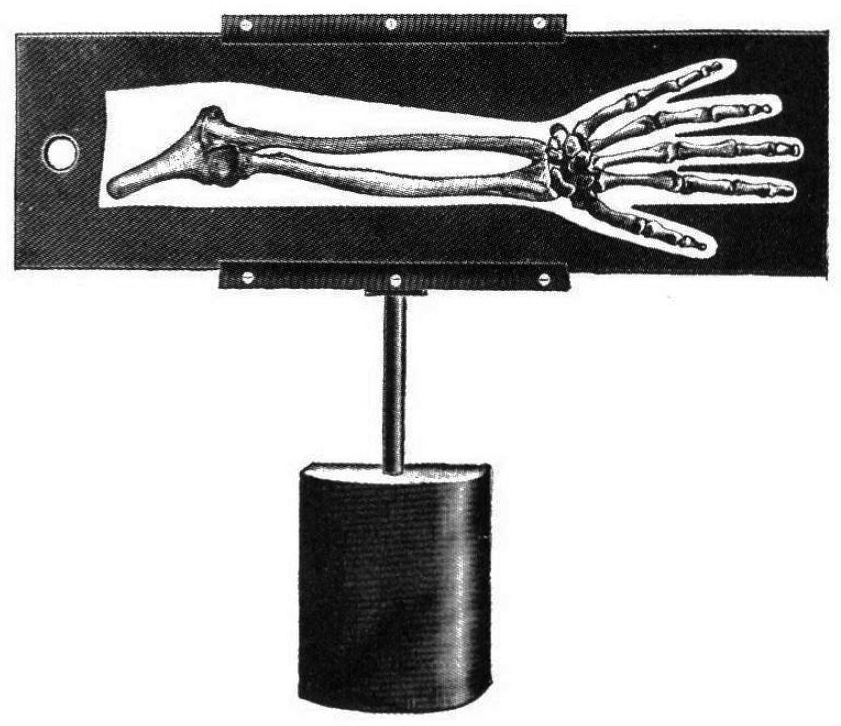 図5. X線質チェック用のOsteoscope.厚紙に上肢の骨格標本を埋め込んであり,軟部の輪郭は錫箔を切り抜いたもの.価格25ドル.X線管球の前に手をかざすかわりに,これを置いて線質を調整するために使った[13].