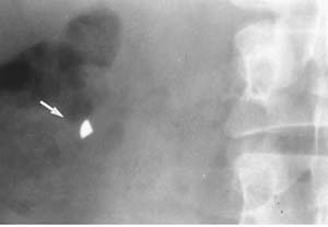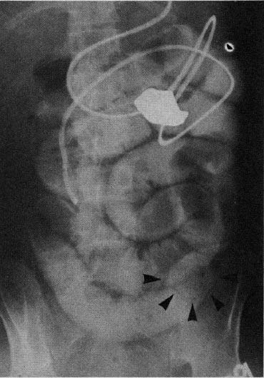 図5.Body packingの初報告例.大麻を充填したコンドーム(矢印)による閉塞性イレウス.口側の小腸が拡張している.イレウス管からの消化管造影[10].