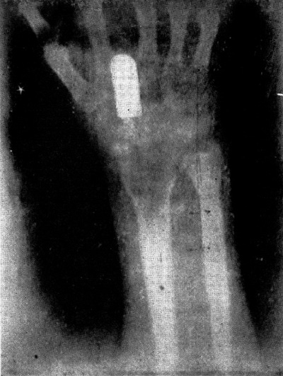 図3.前腕から入射した弾丸が,橈骨を破壊して手に残存している.