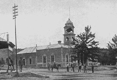 図10.病院として接収したLadysimithの市役所.時計塔に砲弾による破壊のあとが見える[2].