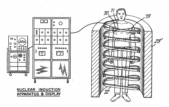 著者のDamadian自身は,画像化については少なくともこの時点では画像化のことは念頭においておらず,この論文発表の翌年に申請した特許[5]も,人体をコイルの中にいれてNMR信号を測定するというきわめて漠然としたアイデアであり,実動するようなものではなかった(図3).