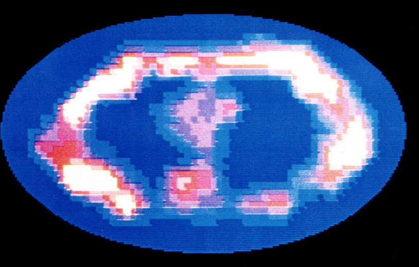 図11. Damadianが発表した世界初の体部MRI画像.第8胸椎レベルの胸部水平断.撮像時間4時間以上を要した[18].