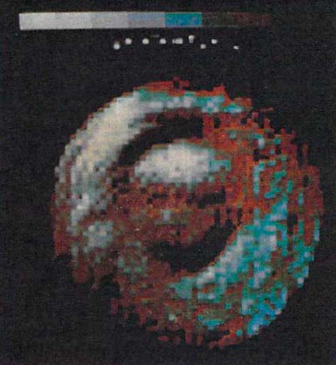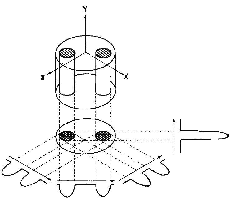 【要旨】静磁場(60MHz)と勾配磁場(700Hz/cm)を用いて,水を入れた内径1mmのガラス毛細管の1次元投影が得られる.被写体あるいは勾配磁場を回転することによって何回か測定を繰り返し,既知の再構成法(ここでは逆投影法)を用いれば,2次元的な投影が得られる(図4).この方法をズーグマトグラフィ(zeugmatography)と呼ぶことを提案する.