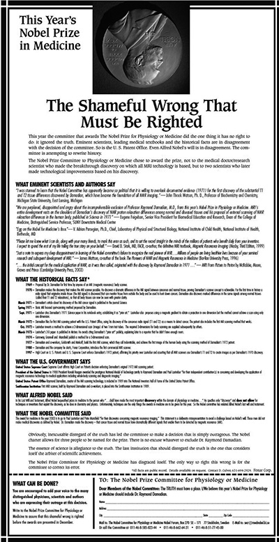 2003年,LauterburとMansfieldがMRIの発明に対してノーベル生理学・医学賞を受賞した際,Damadianは自分が選に漏れたことに立腹し,The New York Timesなどいくつかの新聞に大々的な反論広告を掲載して見直しを要求したが(図10),もちろんこれが覆ることはなかった.DamadianがMRIの発明者としてノーベル賞に相応しいかという点については意見の分かれるところで,NMRの医学応用の可能性を示したことは確かであるが,画像化への寄与は乏しかったと言えよう.