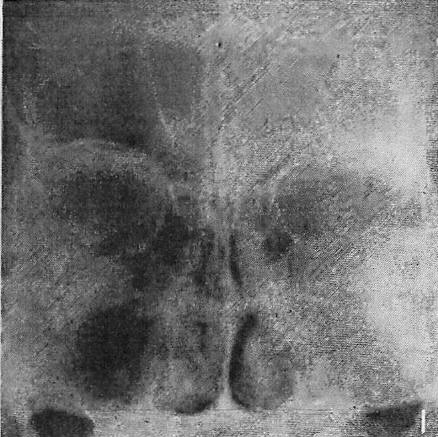 図5. 「Caldwell法」による頭蓋撮影.主に前頭洞の撮影を目的に考案された.右前頭洞,右上顎洞(写真の右が患者の右)の透亮が失われている.