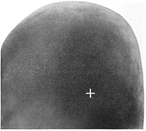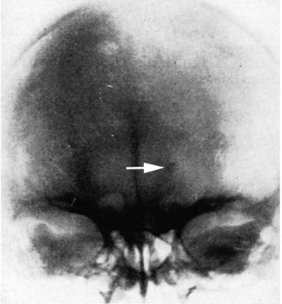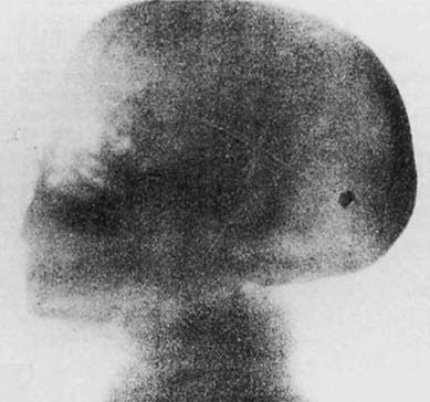 図1. X線写真が脳疾患の診断に役だった史上初の症例.後頭部に銃弾が認められる[2].