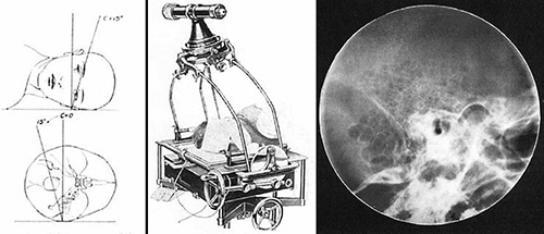 頭蓋内の描出は難しかったが,含気のある副鼻腔についてはX線写真によってその構造や病変を診断できる余地があった.この時期の代表的な研究として,現在もCaldwell法として使われている Eugene Wilson Caldwell による副鼻腔撮影法の研究が挙げられる[→原著論文].