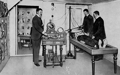 図2. Thor StenbeckのX線撮影室(1899年).患者の頭部の直上にX線管球を懸架している[13].