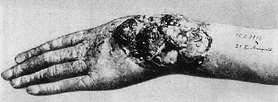 図2. 放射線による皮膚障害.1904年からX線技師として毎月300~400枚の撮影に従事,半年後から両手の発赤,腫脹が出現.上図は1911年,皮膚の乾燥,角化があり小潰瘍も認められる.その後手関節部に潰瘍が出現,増悪.皮膚癌と診断され1913年,左前腕を切断(下図)[1]