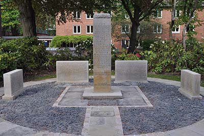 図10. ハンブルクの聖ゲオルク病院の庭に立つ放射線殉職者顕彰碑.1936年に14ヶ国159名の名前を刻んだ碑(中央)が建立された.その後左右4枚の碑板が追加され,総計359名が顕彰されている[20].