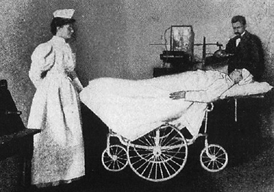 図1.当時のX線撮影の様子.患者(下)の手を撮影する前に,まず術者(上)が自分の手をX線にかざして透視し,X線の強度,線質をチェックしている.このため医師や技師の手には皮膚障害が頻発した[7].