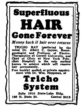 トリコ・システムの一般向け広告には,次のように書かれている[22].「トリコ波(毛髪波)は,25年以上前,コーネル大学医用電気学教授,ニューヨーク工科学校講師のDr. Albert C. Gayserにより発見されました.Dr. Gayserはマルコーニの波動選択システムを適用してトリコ装置を開発し,過去10年間に数千人の女性,男性の治療に成功しています.トリコ波は特別に選ばれた波動で,聞いたり,見たり,触れたりできません.トリコ波は,ラジオ波のように毛髪に沿って毛乳頭に達し,乳頭を破壊するのです」.ここではトリコ波(Tricho wave)という名称を使用しており,これがX線であることを表に出していない.