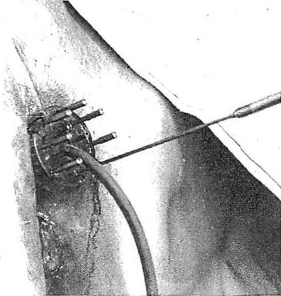 図11.尿道癌のラジウム針治療.病変部に事前に中空針を刺入しておき,ここにラジウムを装填したステンレス管(インサート)を後から挿入する.長い棒(ハンドル)でインサートの1本を挿入しているところ.
