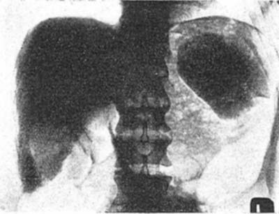 図2. トロトラスト静注による肝脾造影(hepatolienography).トロトラストが肝,脾に沈着し,高濃度に認められる.[2]