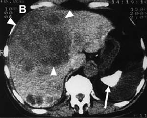 図6. 69歳男性.49年前,上肢骨折に対してトロトラストにて血管造影を施行,急性腹症にて発症.大きな低吸収の腫瘍があり(▲),その周囲にはトロトラスト沈着による網目状の高吸収が認められる.病理診断は血管肉腫. 脾の高吸収,高度萎縮(→)も認められる[9].