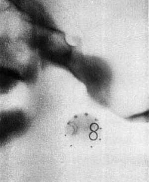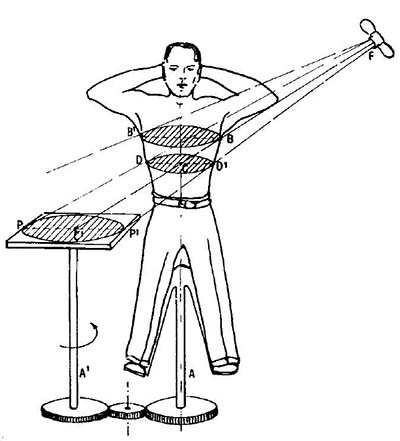 図8."Tomograph".被写体を中心として管球とフィルムが円弧を描いて移動する様子を多重撮影で示したもの.その後,断層撮影を表わす一般名(tomography)となった.