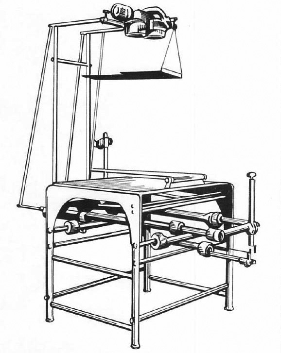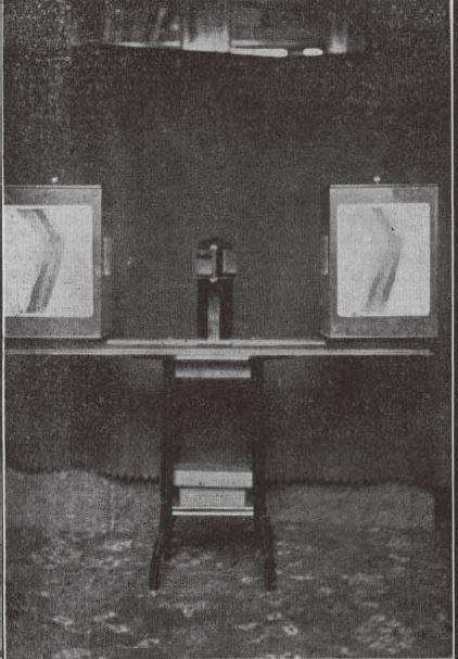 図3. Laminagraph.右側の回転椅子に患者が座り,左側の回転テーブルにフィルムを載せる[15].
