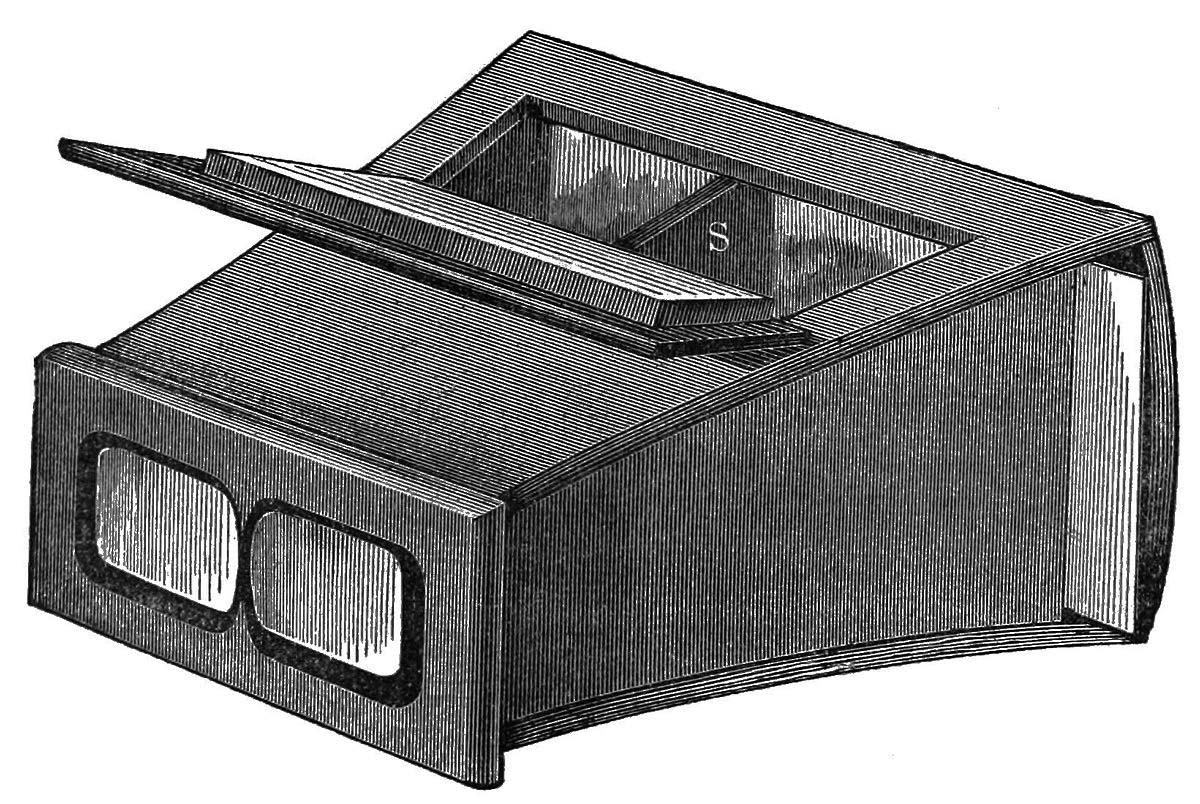 図13. Wheatstoneが考案したステレオスコープ.中央にある2面鏡に左右の画像を反射させて立体視する[PD].