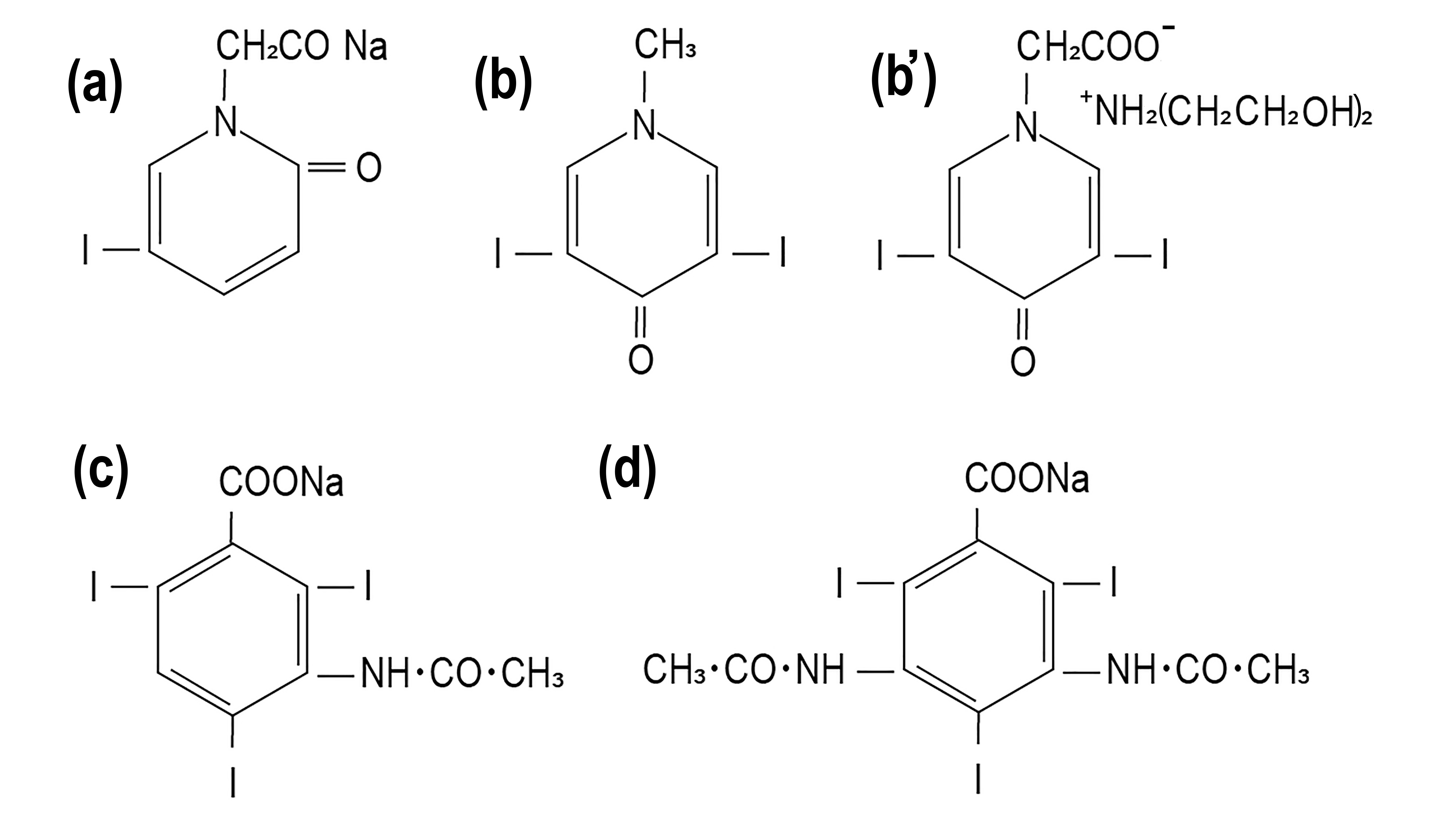 図2. 有機ヨード造影剤.(a)Uroselectan. ピリドン核にヨード1分子を持つ.世界初の有機ヨード造影剤. (b)Uroselectan B, (b') Diodrast. Uroselectranの改良版.ヨード2分子を有する .(c)Urokon.ベンゼン核にヨード3分子を有し,その後のヨード造影剤の基本となった. (d)Conray.Urokonの改良版.非イオン性造影剤の登場まで30年以上にわたって臨床に供された.